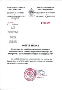 COMMUNIQUÉ DE MONSIEUR LE DOYEN A L’ATTENTION DES MEMBRES DES JURYS ET DES CANDIDATS AU RECRUTEMENT DU REMPLACEMENT NUMÉRIQUE DE 26 ASSISTANTS À L’UNIVERSITÉ DE YAOUNDÉ 1 Continue Reading → 11 SEP 2025 0 Share